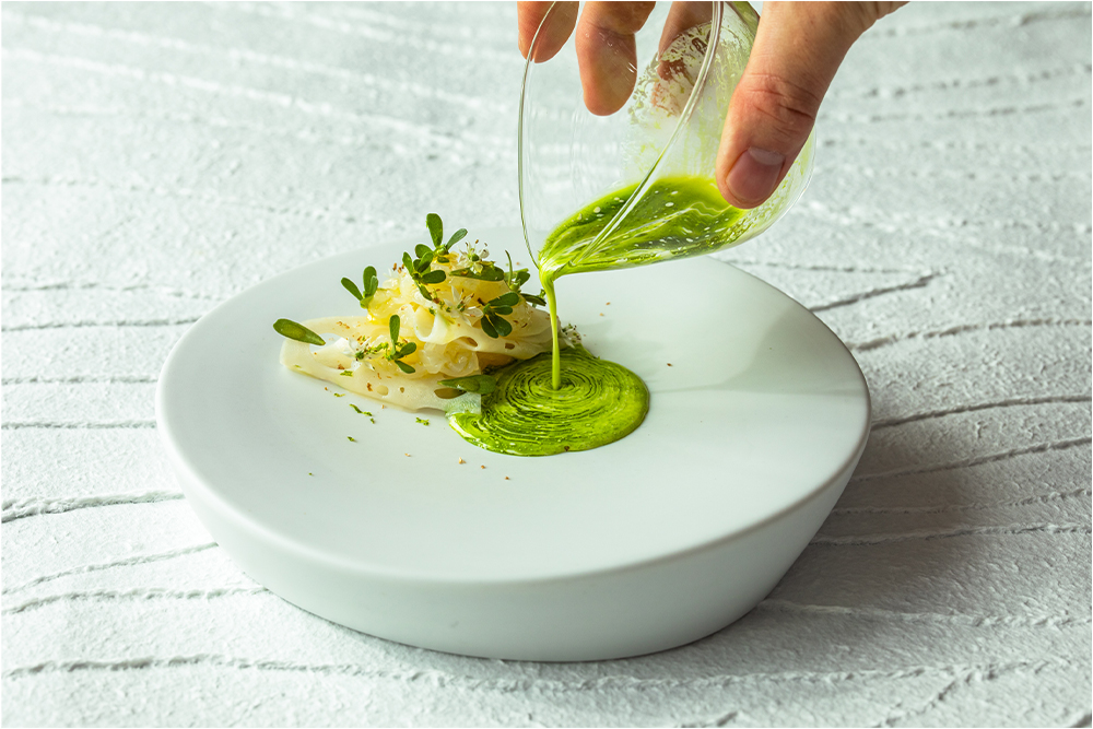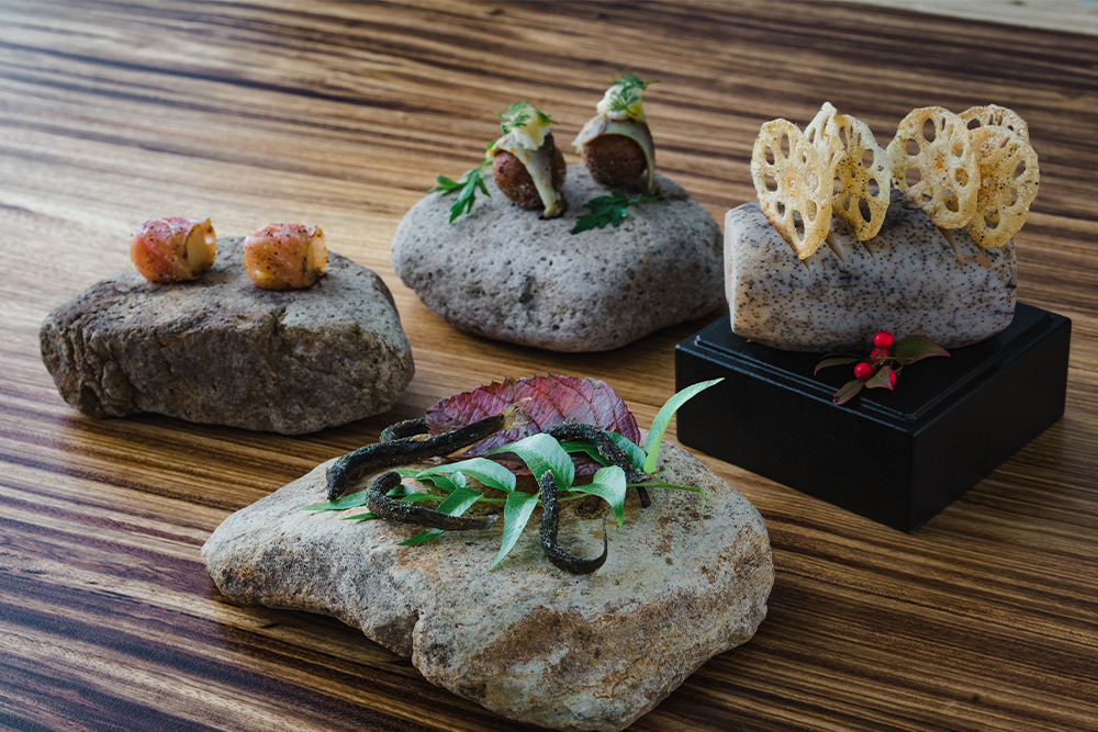 각 곳에 현대 미술이 전시된 건물 내부는 세련된 공간이면서도 어딘가 낯익은 분위기. 셰프는 이토이 쇼타(SHOTA ITOI) 씨. 26살 때 국내 요리사 대회에서 그랑프리를 수상했고, 2023년에는 ‘고에미요’ 일본판에서 “기대의 젊은 셰프상”을 수상하는 등 화려한 경력을 가지고 있습니다. 그는 코마쓰로 이주하여 이 지역에만 있는 식재료”를 활용해 자유로운 사고와 감성으로 요리에 담아냅니다. 오랜 세월 사람들이 이 초등학교에서 자라며 그 기억을 반영하는 듯한 요리는 완성도가 넘치는 이노베이티브 요리입니다.