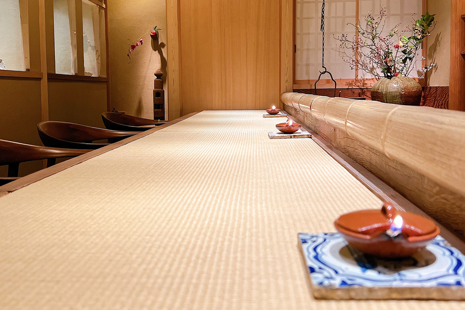 ‘이곳은 다실인가? 미술관인가?’ 라고 착각할 정도로 비일상적인 느낌이 넘치는 가게 내부는 카운터석의 안쪽에 일본의 모모야마 시대, 중국의 명나라 시대, 조선시대를 주로 다룬 고미술품 등이 전시되어 있는 공간이 있으며, 손님에게 제공하는 요리에도 이를 한껏 사용해 일본의 전통과 문화를 퍼뜨리는 것을 컨셉으로 한 일본 요리 “츠키오카(月おか)”. 일본의 식문화를 세계에 널리 알리고 싶어 뉴욕에 가려 했으나 코로나 바이러스의 발병 때문에 단념했습니다. 그 열정을 가슴에 품은 채 교토에 개점한 것이 바로 이 가게입니다.