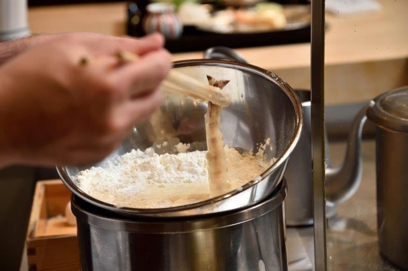 The batter is drained of oil, resulting in even lighter tempura, and guests can enjoy the natural flavors and aromas of the seasonal ingredients freshly delivered from the market. The staff also carefully manages the humidity inside the restaurant so that the light, delicious batter of the tempura is not affected by it. Each piece of tempura is carefully deep-fried one at a time and the original flavors of the ingredient is that of the utmost importance.
