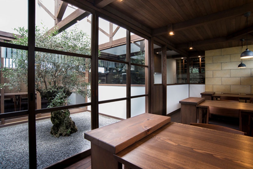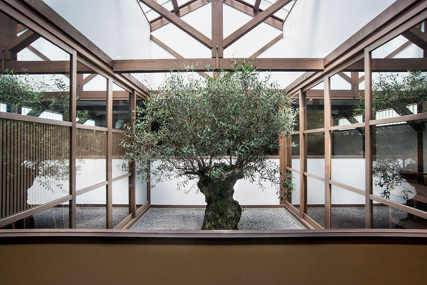 It resides in a renovated former yarn factory built over 50 years ago. A 200 year-old olive tree stands proudly in the center of the building, filling the restaurant with a feeling of harmony with nature.