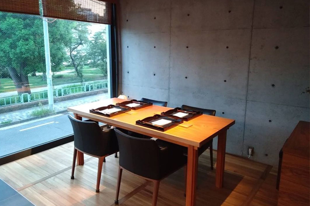 Sui Ohya is one such establishment. The restaurant occupies the second floor of a stylish concrete building located along the Okawa River in Tenmabashi, which offers splendid views of cherry blossoms in spring and lush greenery in summer, .