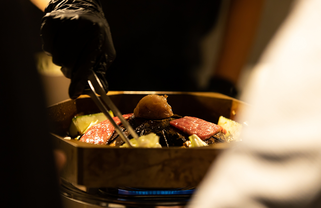 The “teppan” cookware on which the guests cook their meat is the very first exclusive Wagyu cooking pot in the world, each costing 500,000 yen to manufacture and created by carefully selecting its metal and using precision metal-cutting technology, in order to bring out the best from all the ingredients.