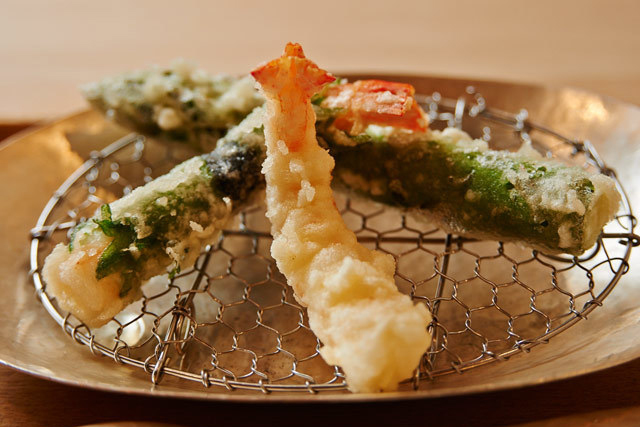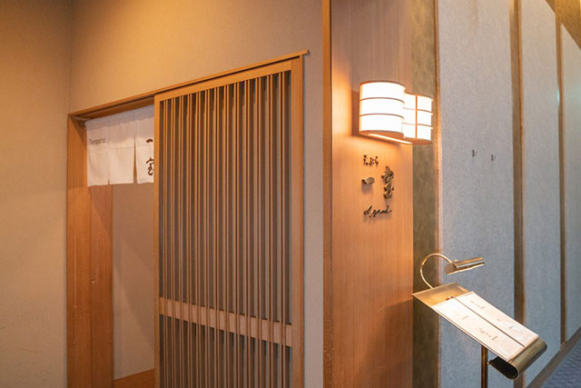 之后再安排移动至包厢的吧台式座位享用天妇罗,可体验到各种店内的和式风情。
